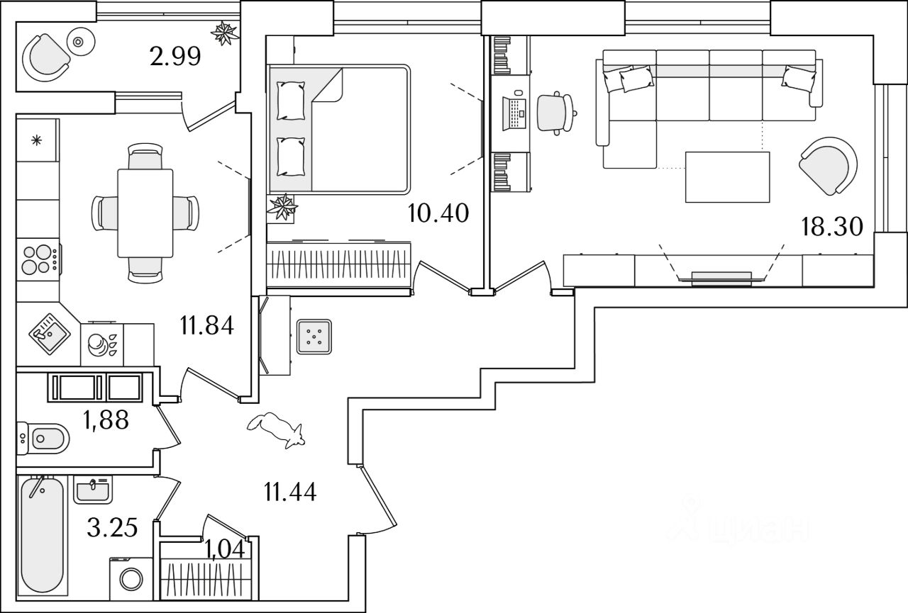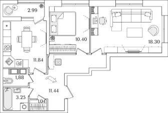 Квартира находится в 22 этажном доме, в Корпус 5 на 20 этаже. Общая площадь квартиры 59,65 кв.м.