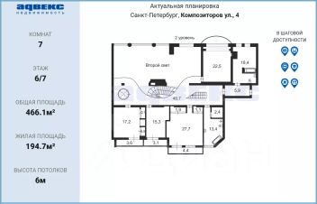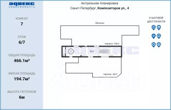 Расположена на 3 уровнях - 6 и 7 этажи плюс мезонин-надстройка + эксплуатируемая крыша 188 кв.м! Планировки всех трех уровней ищите в фотографиях.