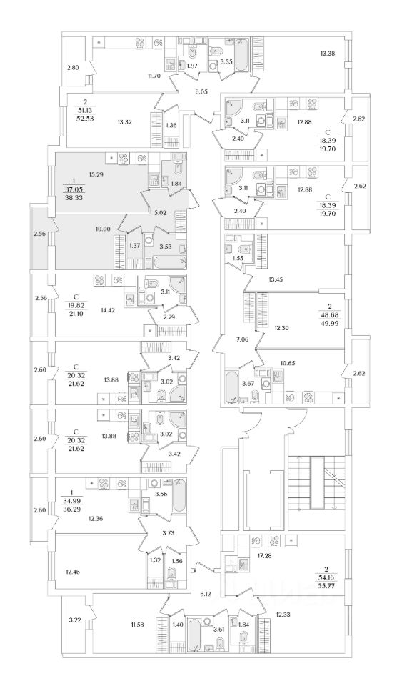 Квартира находится в 9 этажном доме, в Очередь 1, Корпус 2 на 7 этаже. Общая площадь квартиры 38,33 кв.м.