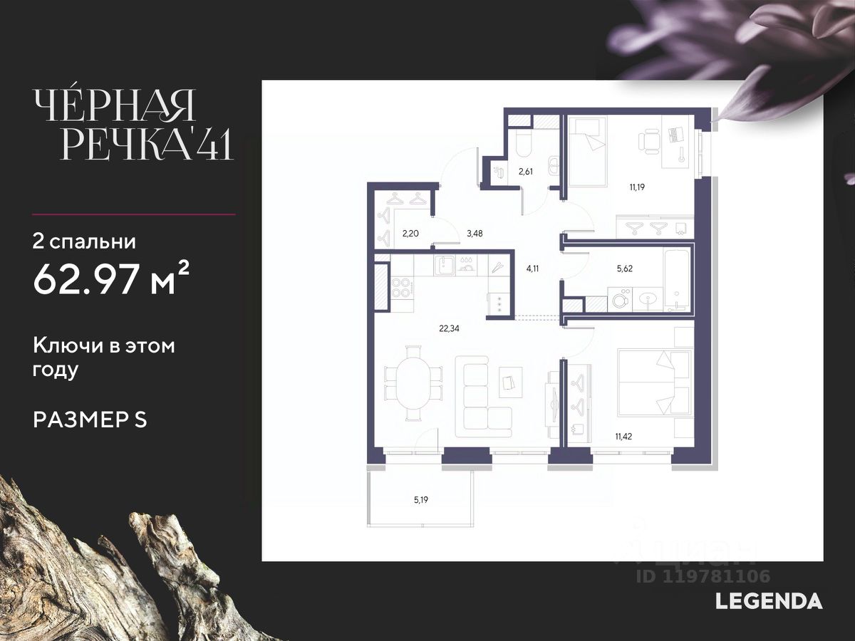 Продается 2-комн. квартира от застройщика с предчистовой отделкой в ЖК "Черная Речка, 41" на 8 этаже. Общая площадь: 62.97 кв.м., жилая: 22.61 кв.м., площадь просторной кухни-столовой: 22.34 кв.м. Угловая квартира, идеально подойдет любителям тишины и панорамных видов. В квартире один балкон, один раздельный санузел. Высота потолков 3.0 м.