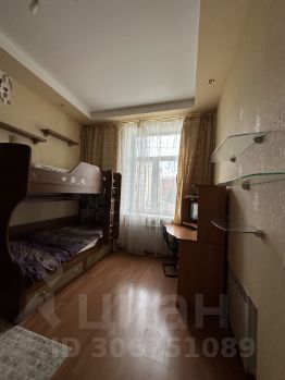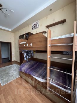 В детской стоит двухъярусная кровать, книжный шкаф, компьютерный стол, и угловой шкаф для хранения вещей.