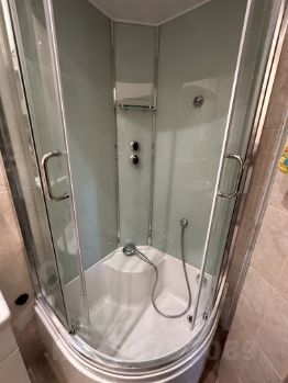 Совмещенный санузел, в котором стоит душевая кабина, есть бойлер.