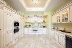 В отделке используются натуральные материалы: массив дуба и ореха, камень, большая часть мебели сделана на заказ или от ведущих европейских брендов