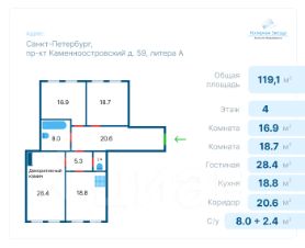 S общ 119,1 / S жил 18,7+16,9+28,4/ Sкух -18,8 кв.м; h -3,40 м.
