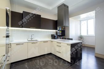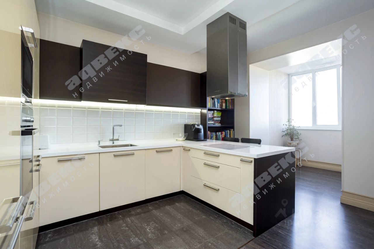 - Большая кухня-гостиная со встроенной кухней, разделенная на две зоны: кухня и зона отдыха.