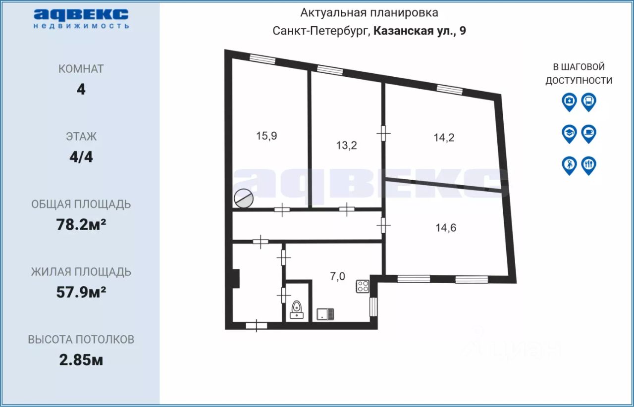 Разнообразная инфраструктура и транспортная связь - в 5 минутах ходьбы знаменитые набережные, несколько станций метро в пешей доступности это и станция метро Невский проспект (7 мин), Гостинный двор (8 мин), Сенная, Спасская площадь (10 мин).