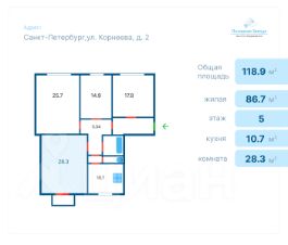 S общ. 118,9 / S ком. 28,3 / S кух.10,7; h 3,20м.