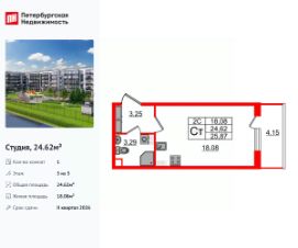 Удобная, классическая, функциональная европланировка, просторная прихожая 3.25 м². Общая площадь студии - 24.62 м², жилая 18.08 м², высота потолка 3.07 м.