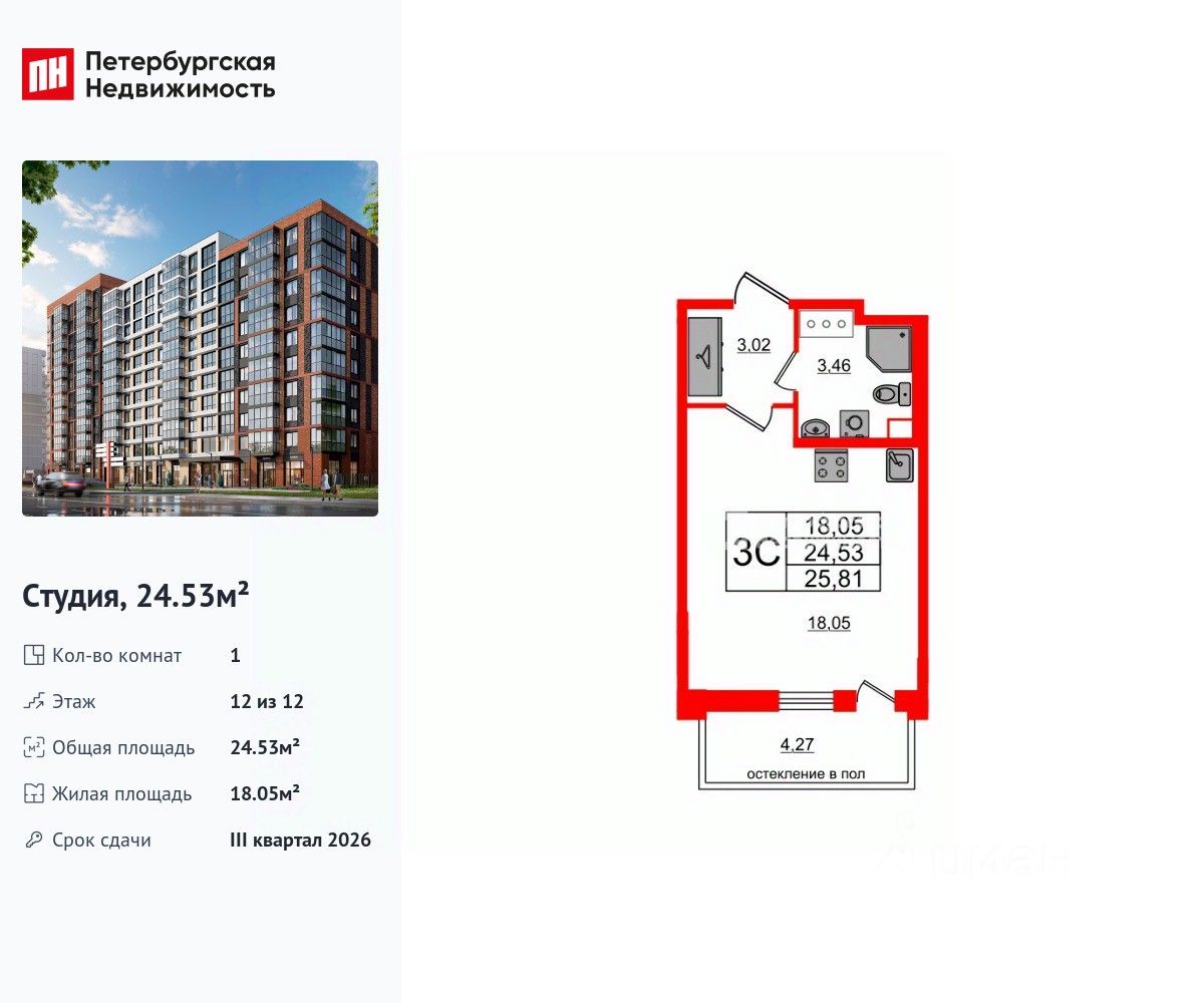 Удобная, классическая, функциональная европланировка, вместительная прихожая 3.02 м². Общая площадь студии - 24.53 м², жилая 18.05 м², высота потолка 3 м.