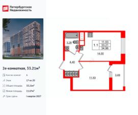 Удобная, классическая, функциональная европланировка, большая кухня-гостиная 14.46 м², просторная прихожая 4.37 м². Общая площадь квартиры - 33.21 м², жилая 11.67 м², высота потолка 2.75 м.