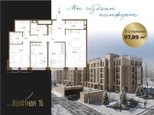 Общая площадь квартиры составляет 97.89 м2 из которых 22,67 м2 отведено под просторную кухню-гостиную с двумя окнами. С мастер спальней площадью 16 м2 со своим сан.узлом и гардеробной. В квартире также предусмотрена прачечная.