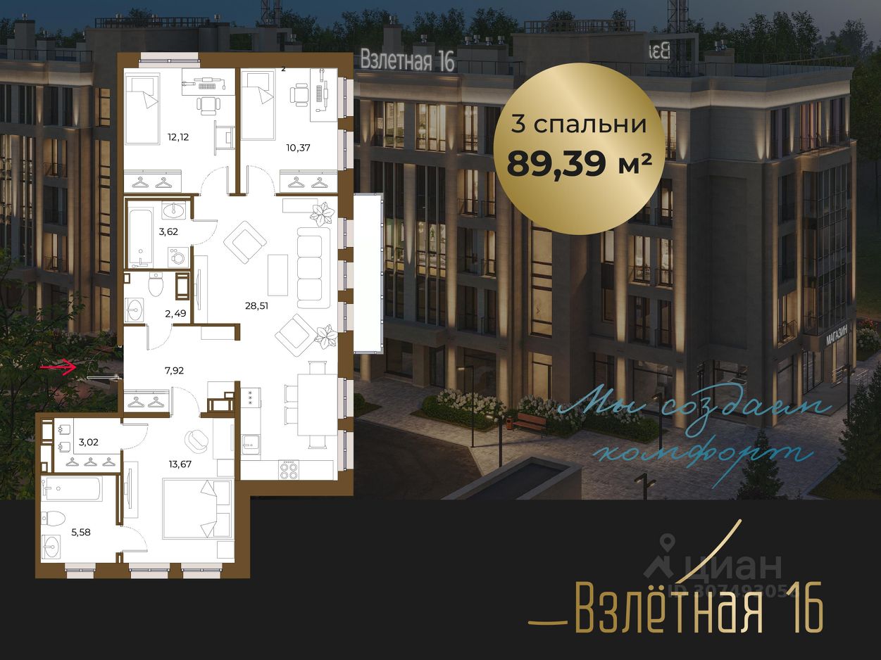 Продается квартира с 3 спальнями в жилом комплексе бизнес-класса "Взлетная 16".
