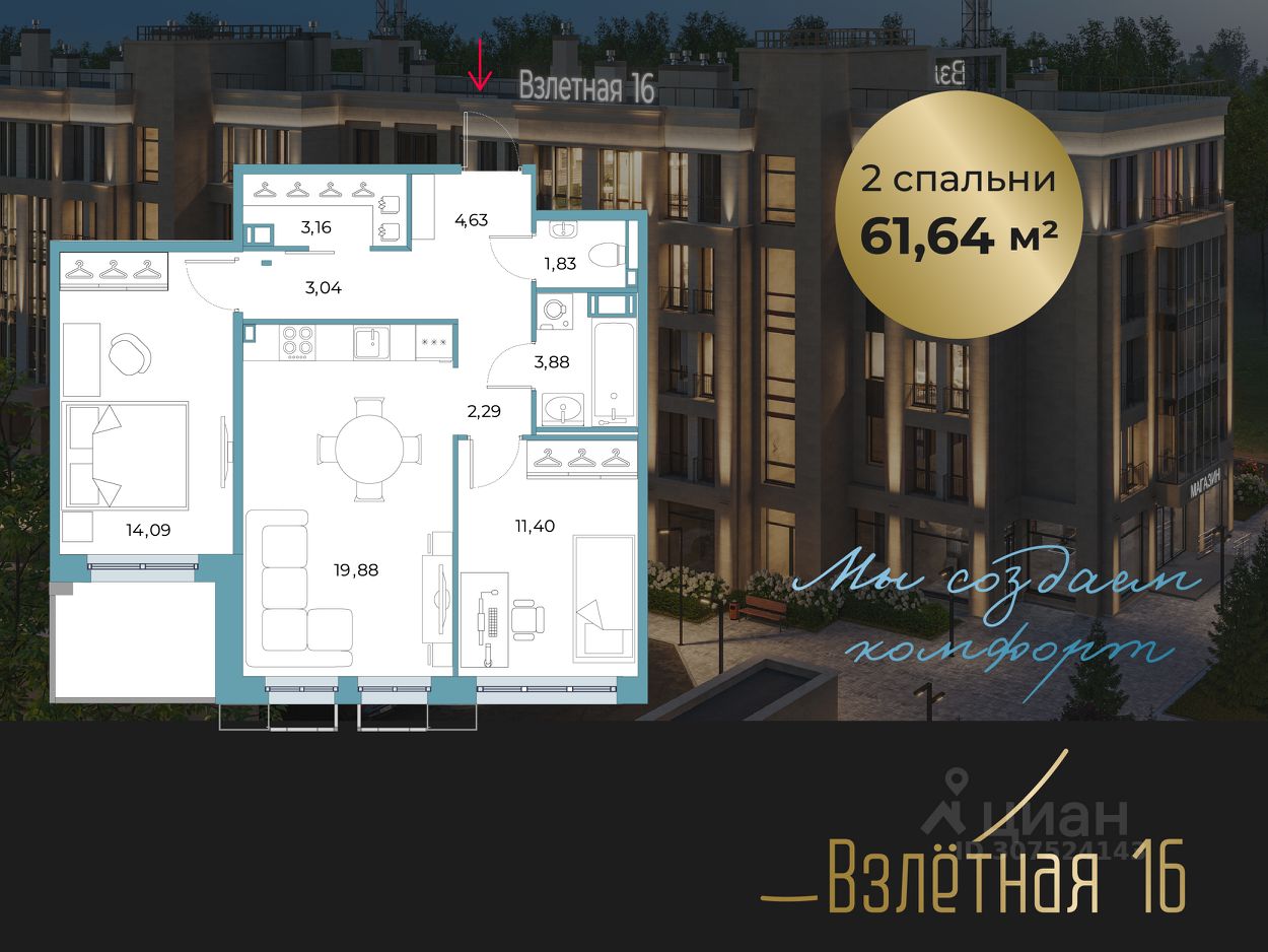 Общая площадь квартиры составляет 61,64 м2, из которых 19,88 м2 отведено под просторную кухню-гостиную с тремя окнами. Спальня 14,09 м2 с выходом на террасу, раздельный сан.узел. Предусмотрена гардеробная.
