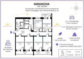 Предлагаем уникальную возможность приобрести светлую, двухстороннюю 5-комнатную квартиру на 3 этаже с капитальным ремонтом и чистовой отделкой в одном из лучших районов Санкт-Петербурга — Приморский район.
