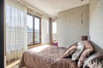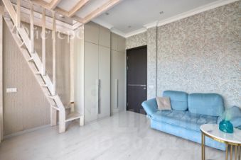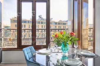 Поднимаемся на 5 этаж и открываем двери одной из двух квартир — на этаже у вас будут только одни соседи. Первое, что впечатляет — потолки: их высота варьируется от 3.1 м до 5 м., что дает ощущение простора. Это достоинство было использовано владельцами квартиры для обустройства в одной из спален антресольного этажа, квартира, имевшая метраж 65 м², увеличилась до 75 м². Внизу находится лаунж-зона, спальная после изменений переместилась на уровень выше.