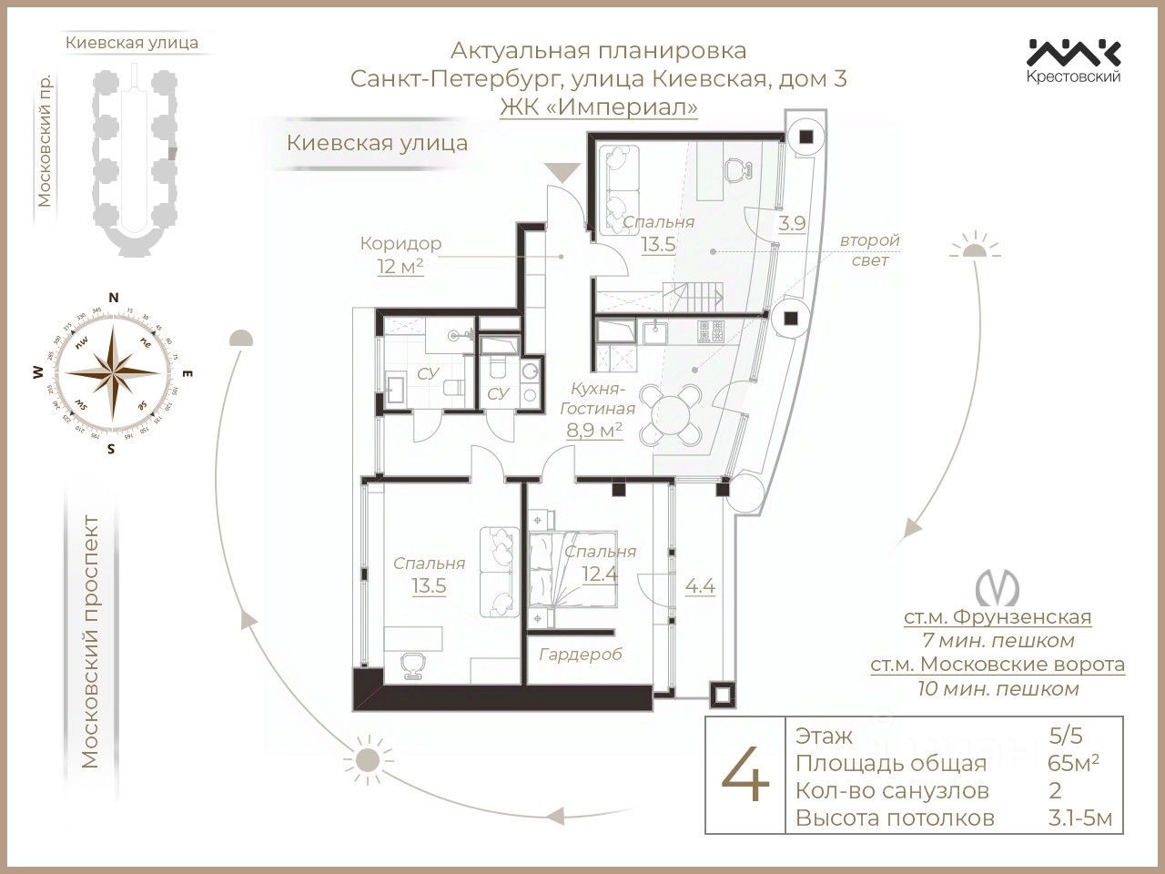 комфортная транспортная доступность для владельцев личных автомобилей и тех, кто пользуется общественным транспортом. По Московскому проспекту можно быстро добраться до любого района Петербурга, до центра — 5 минут, до аэропорта — 20 минут. Станция метро Фрунзенская находится в шаговой доступности: до нее 7 минут пешком от парадной;