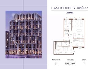 Квартира с тремя спальнями в комплексе "Сампсониевский 32" от LEGENDA на 7 этаже.