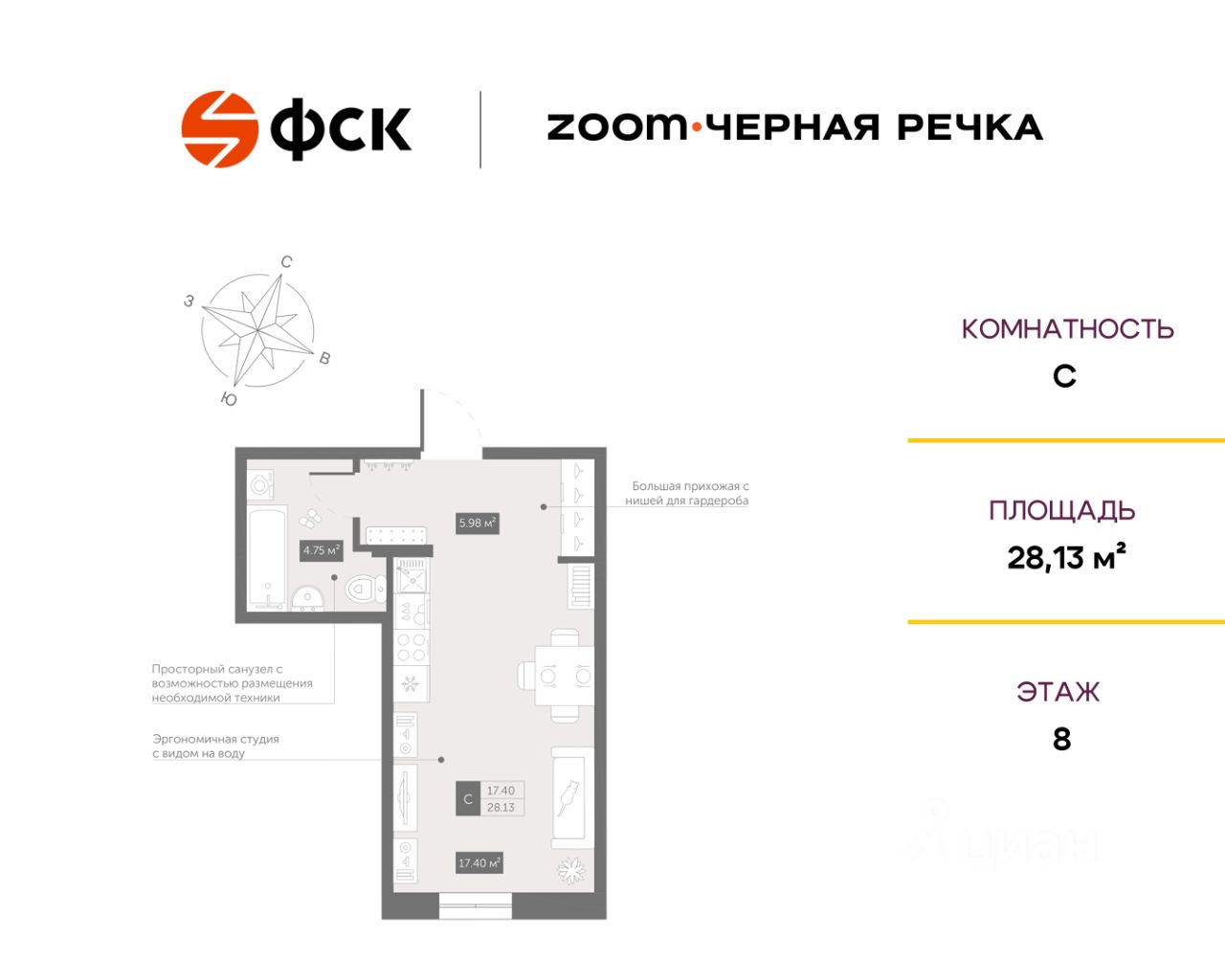 Цена со специальной скидкой в прямой продаже от застройщика — только в этом месяце. Апартамент-студия в комплексе класса бизнес-лайт Zoom Чёрная Речка на 8-м этаже. Общая площадь 28,13. Предчистовая отделка.