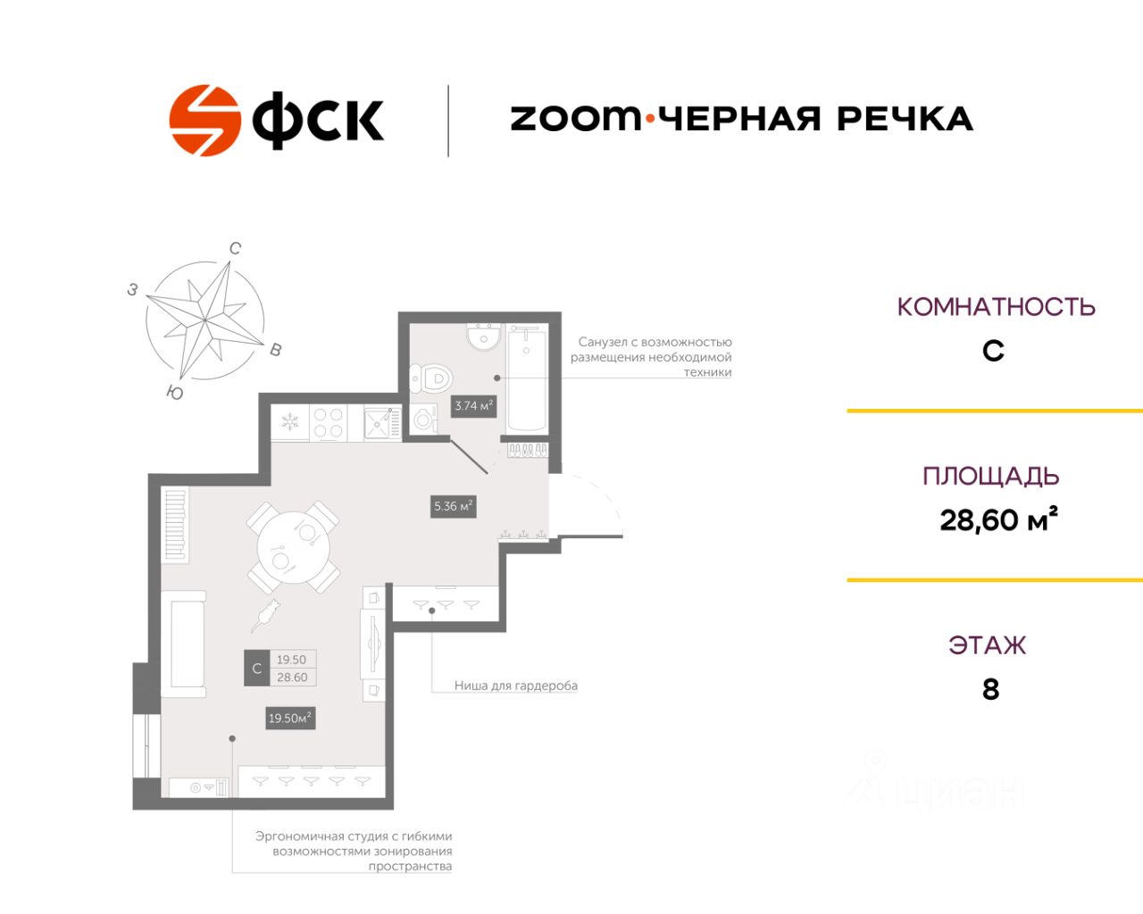 Цена со специальной скидкой в прямой продаже от застройщика — только в этом месяце. Апартамент-студия в комплексе класса бизнес-лайт Zoom Чёрная Речка на 8-м этаже. Общая площадь 28,6. Предчистовая отделка.
