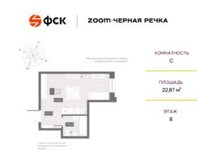Цена со специальной скидкой в прямой продаже от застройщика — только в этом месяце. Апартамент-студия в комплексе класса бизнес-лайт Zoom Чёрная Речка на 8-м этаже. Общая площадь 22,87. Предчистовая отделка.