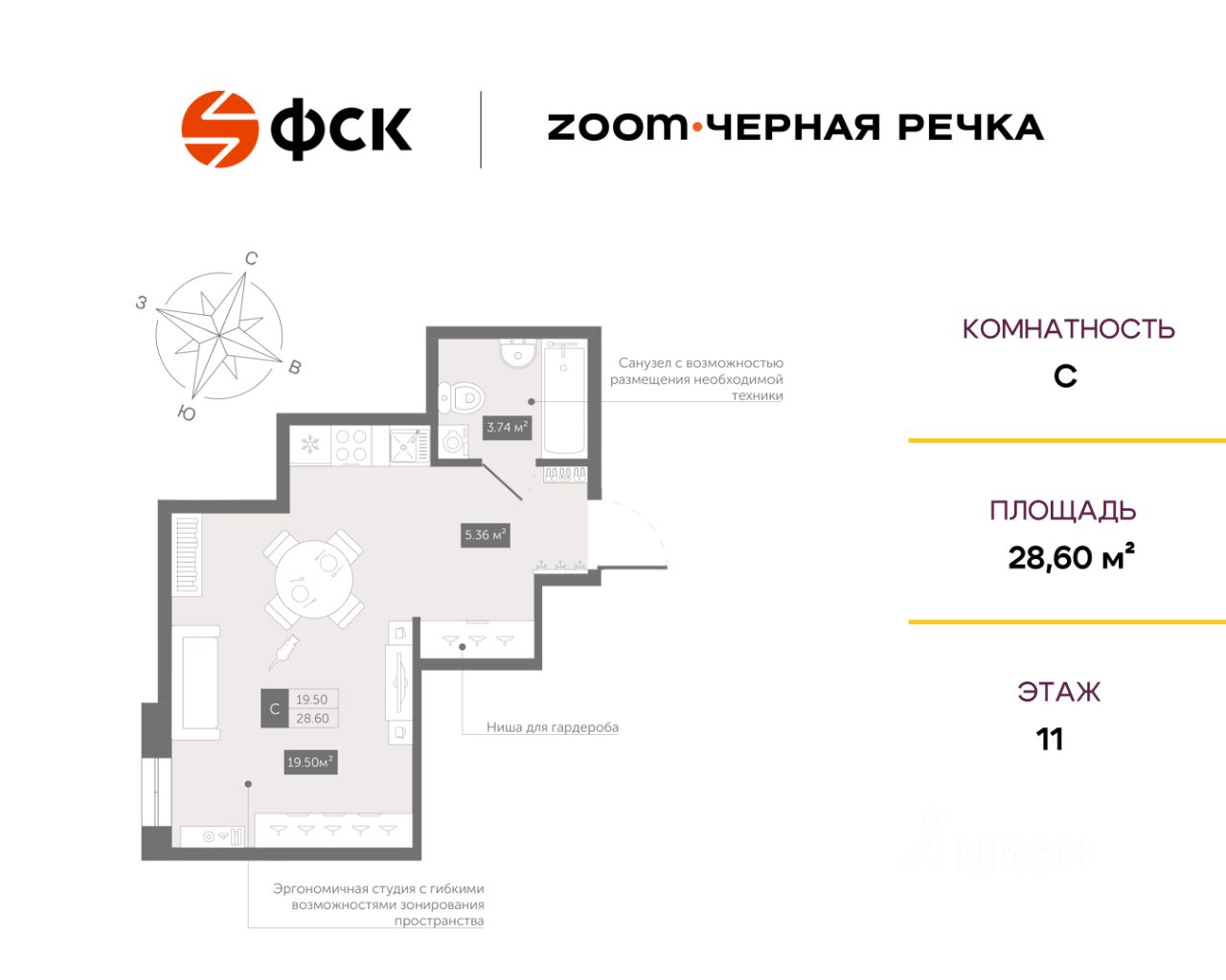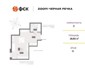 Цена со специальной скидкой в прямой продаже от застройщика — только в этом месяце. Апартамент-студия в комплексе класса бизнес-лайт Zoom Чёрная Речка на 11-м этаже. Общая площадь 28,6. Предчистовая отделка.