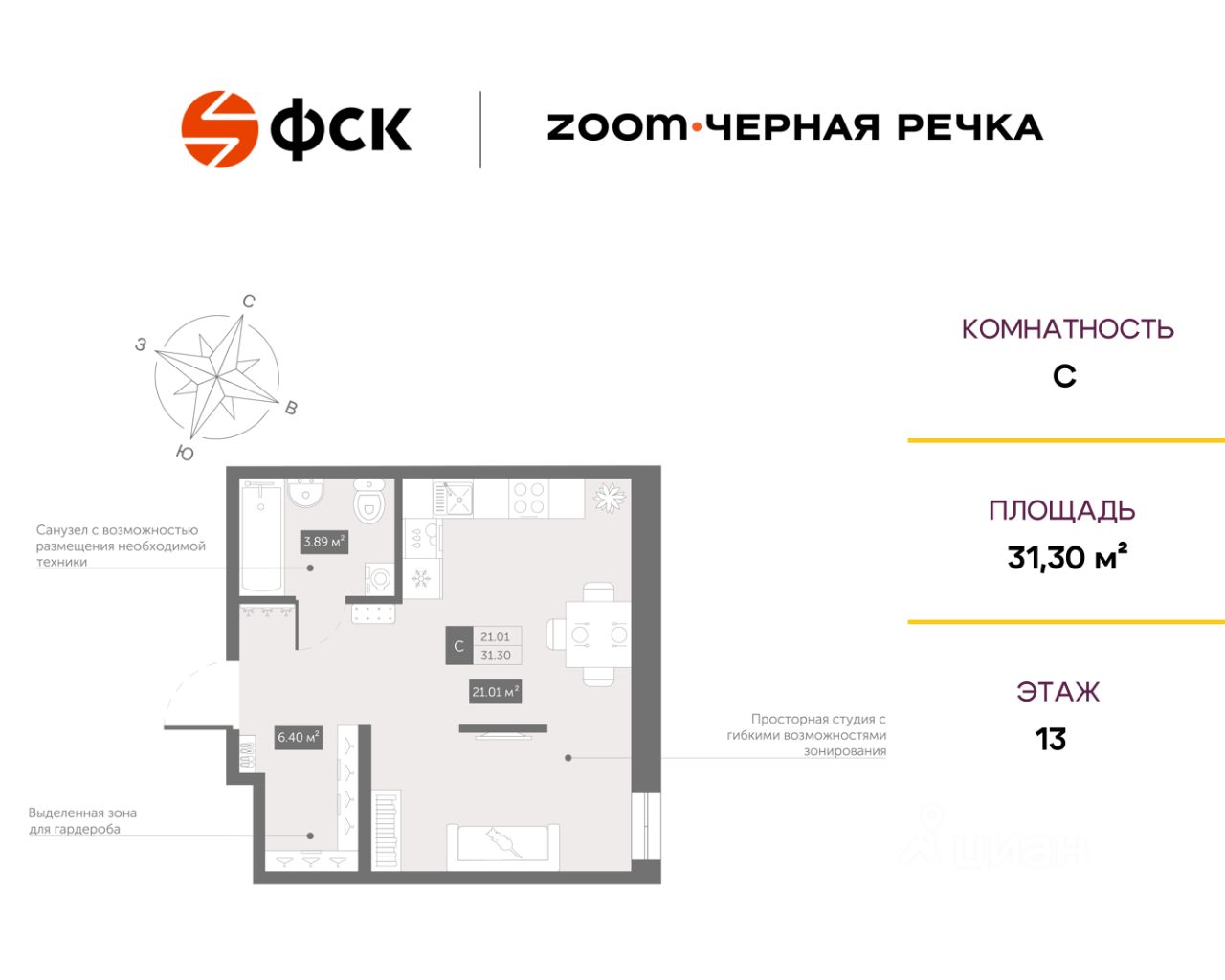 Цена со специальной скидкой в прямой продаже от застройщика — только в этом месяце. Апартамент-студия в комплексе класса бизнес-лайт Zoom Чёрная Речка на 13-м этаже. Общая площадь 31,3. Предчистовая отделка.