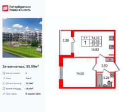 Удобная, классическая, функциональная европланировка, большая кухня-гостиная 14.63 м², вместительная прихожая 3.63 м². Общая площадь квартиры - 35.59 м², жилая 14.05 м², высота потолка 2.77 м.