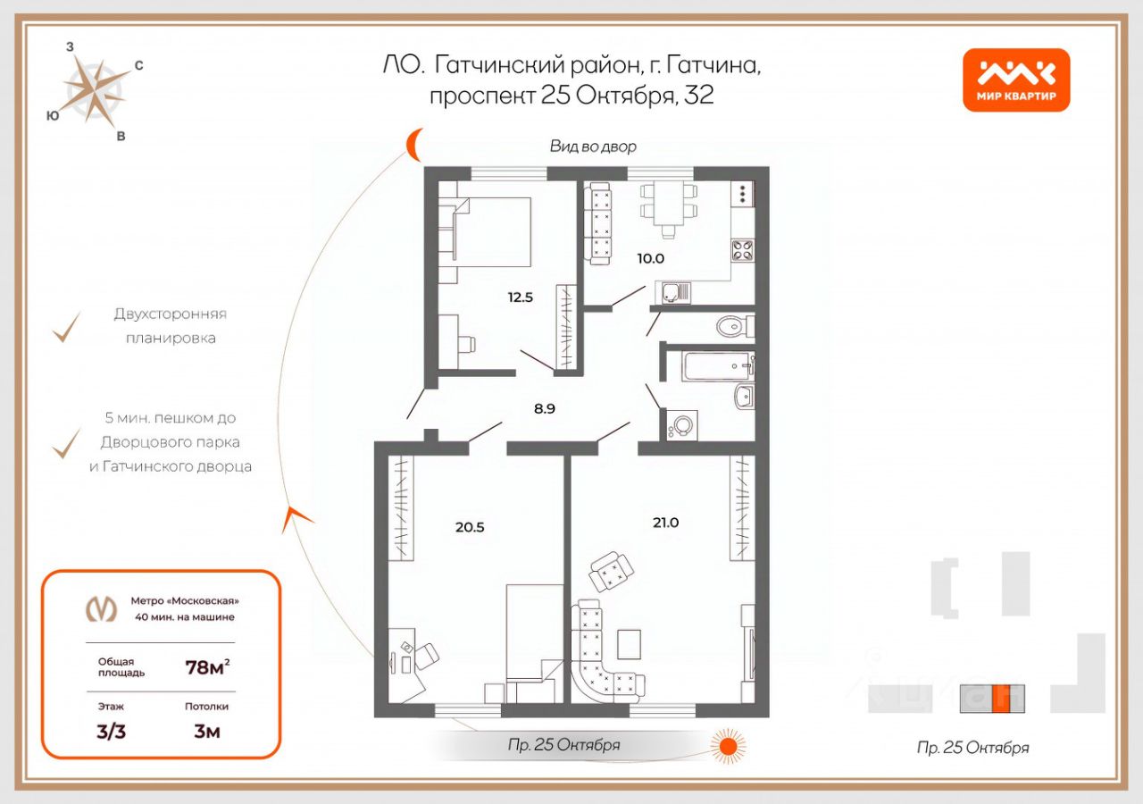 Общая площадь квартиры — 78 м². Из окон кухни (10 м²) и одной из спален (12,5 м²) открывается вид на просторный зеленый двор, где всегда достаточно мест для парковки. Окна двух других комнат (20,5 м² и 21 м²) выходят на пр-кт 25 Октября.