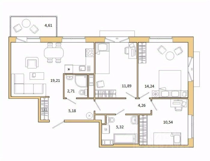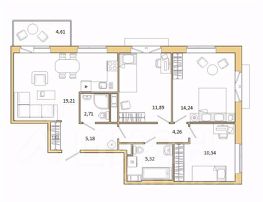 —Огромный зал с кухней, 3 больших изолированных комнаты, 2 санузла, гардеробная, застеклённая лоджия, множество мест для хранения.