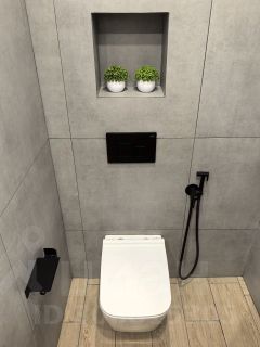 Санузел выложен плиткой, унитаз с инсталляцией, гигиенический душ, современный электрополотенцесушитель с таймером.