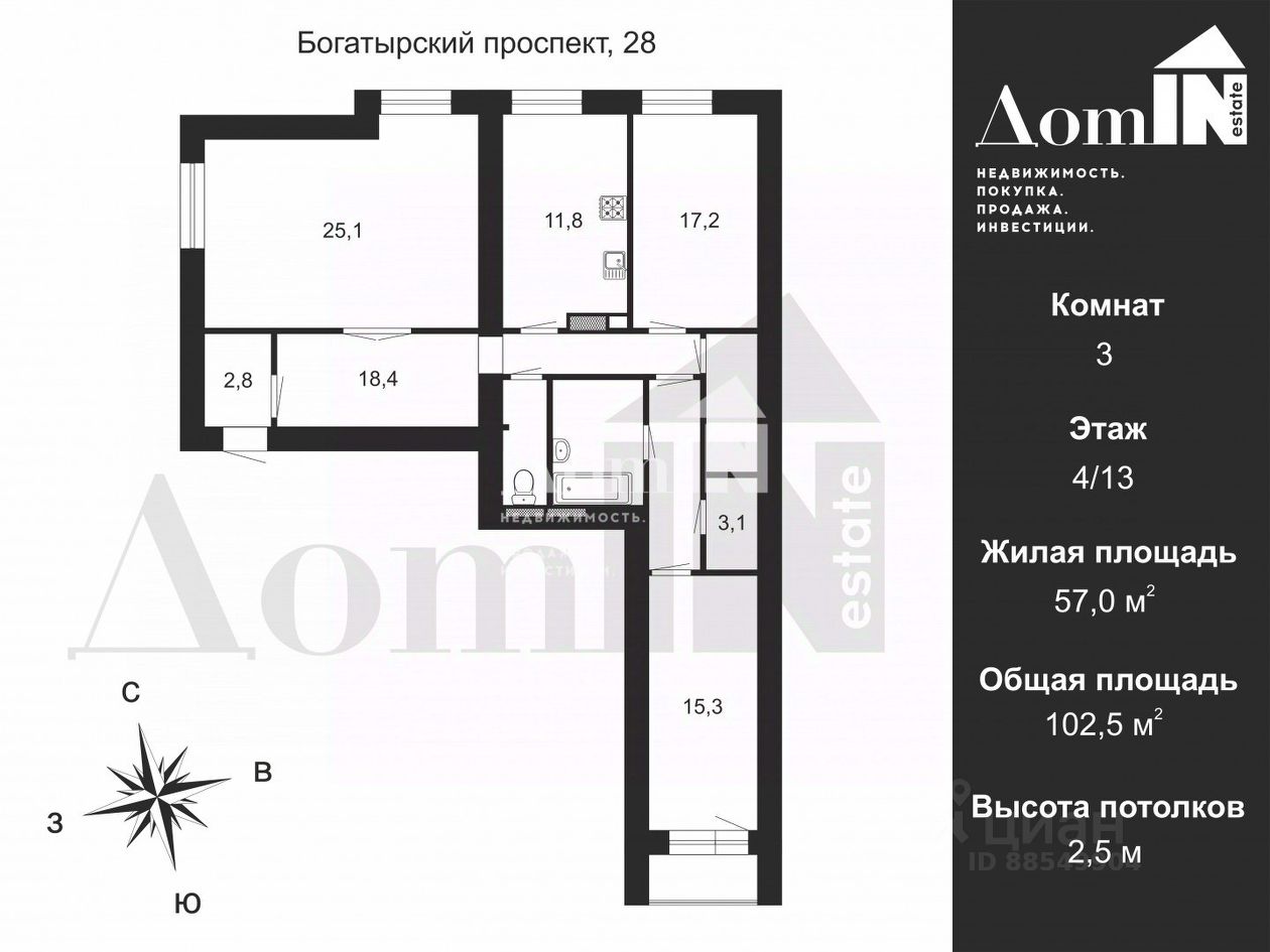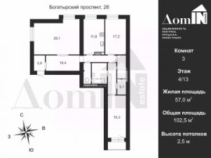 Общая плoщaдь квартиpы 102.5 кв.м., жилая площадь 57 кв.м., площадь кухни - 12 кв.м.