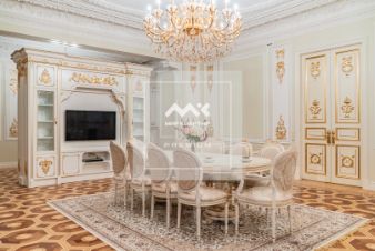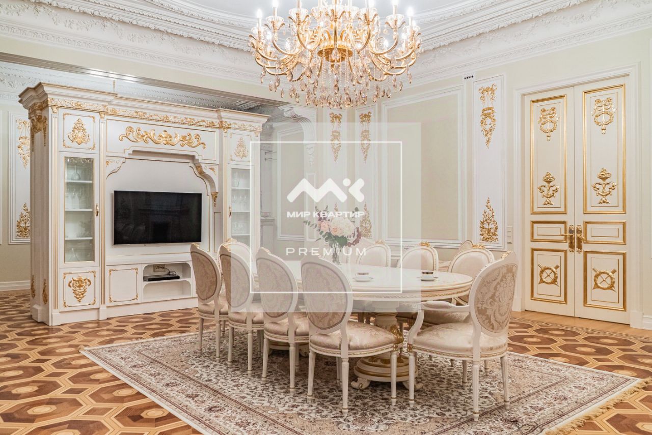 В квартире есть четыре спальни со своими санузлами, кабинет, гостиная, две кухонные зоны и SPA-зона с сауной. Квартира украшена уникальными печами и каминами, наборным паркетом, эркером, лепниной, люстрами, мезонином и атрибутами современного комфорта — семью санузлами, сауной, теплыми полами. Высота потолка 3.70 м.