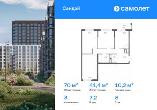 Строим кварталы для жизни с заботой о будущем. Предлагается 3-комнатная квартира комфорт-класса 70 кв.м в корпусе 7.2 на 8 этаже, в ЖК "Сандэй"