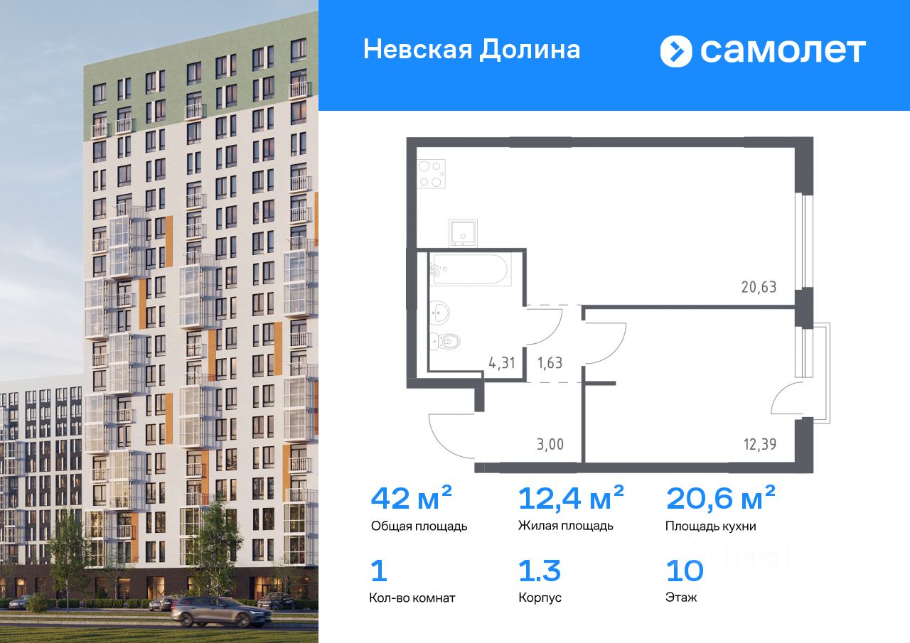 Строим кварталы для жизни с заботой о будущем. Предлагается 1-комнатная квартира комфорт-класса 41,96 кв.м в корпусе 1.3 на 10 этаже, в ЖК "Невская Долина"