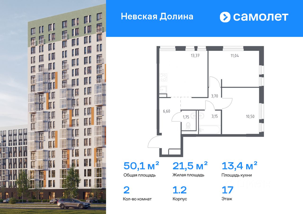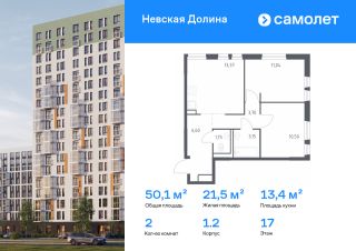 Строим кварталы для жизни с заботой о будущем. Предлагается 2-комнатная квартира комфорт-класса 50,11 кв.м в корпусе 1.2 на 17 этаже, в ЖК "Невская Долина"