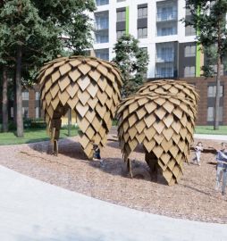 Следуя от частного к общему, от малой формы к крупной - от дерева в вашем дворе к арт объектам, выполненным в цветовых решениях хвойных пород, мы продумали эргономичные формы и минималистичную красоту квартала.