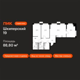 Продаётся 3-комн. квартира площадью 88,8 кв.м на 2 этаже 12 этажного дома (Корпус 1, Секция 8) проекта ПИК Шкиперский 19. Светлый просторный подъезд на уровне земли, функциональная планировка, большие окна, предчистовая отделка.