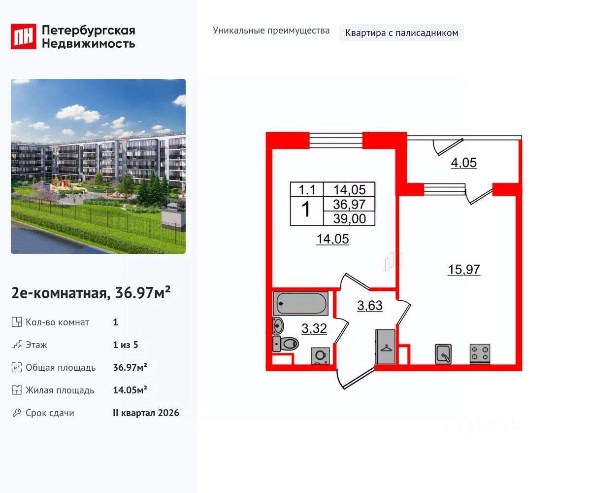 Уникальная, функциональная европланировка, большая кухня-гостиная 15.97 м², вместительная прихожая 3.63 м². Общая площадь квартиры - 36.97 м², жилая 14.05 м², высота потолка 2.77 м.