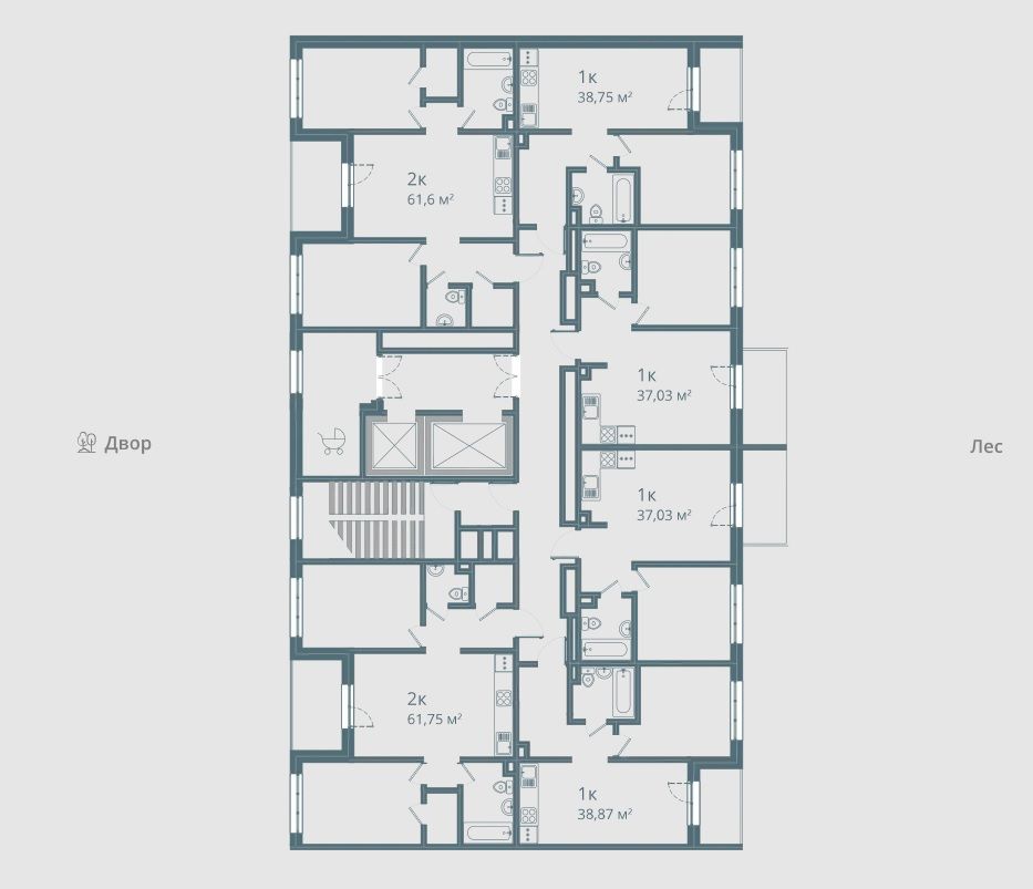Холлы - это продуманные пространства с колясочными, сквозными проходами и приятной музыкой в лифтах.