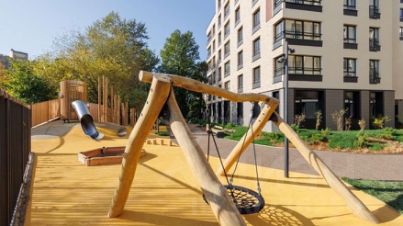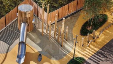 Зонирование: скамейки для уединенного отдыха, игровые зоны для детей и спортивная площадка.