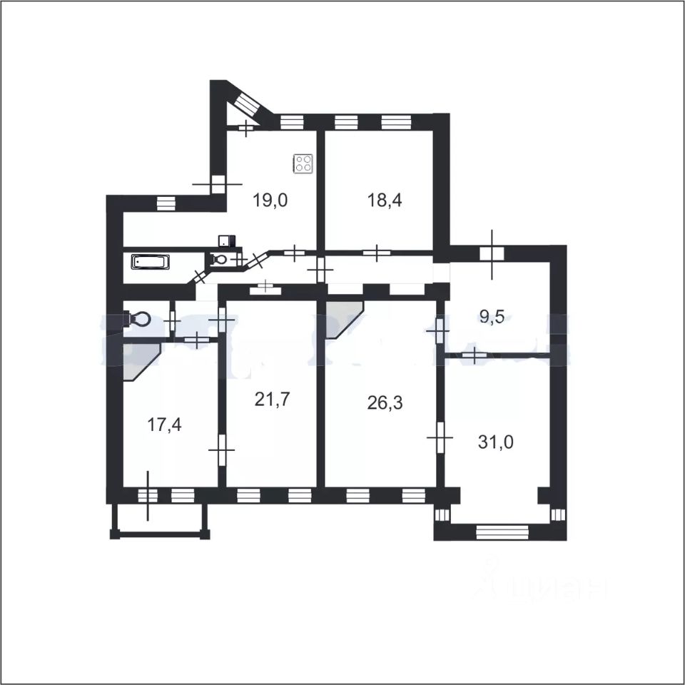 Двухсторонняя, удобная планировка. Четыре комнаты смежные, одна изолированная, граничит с кухней. Из кухни, есть второй выход на лестницу, во двор. Там же выход на мансарду. Два санузла. Ванная комната. Эркер.
