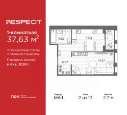 Однокомнатная квартира от застройщика с предчистовой отделкой в ЖК "RESPECT" на 2 этаже. Общая площадь: 37.63 кв.м., жилая: 14.51 кв.м., площадь просторной кухни-столовой: 11.04 кв.м. Все окна выходят на одну сторону. В квартире одна лоджия, один совмещенный санузел. Высота потолков 2.7 м.