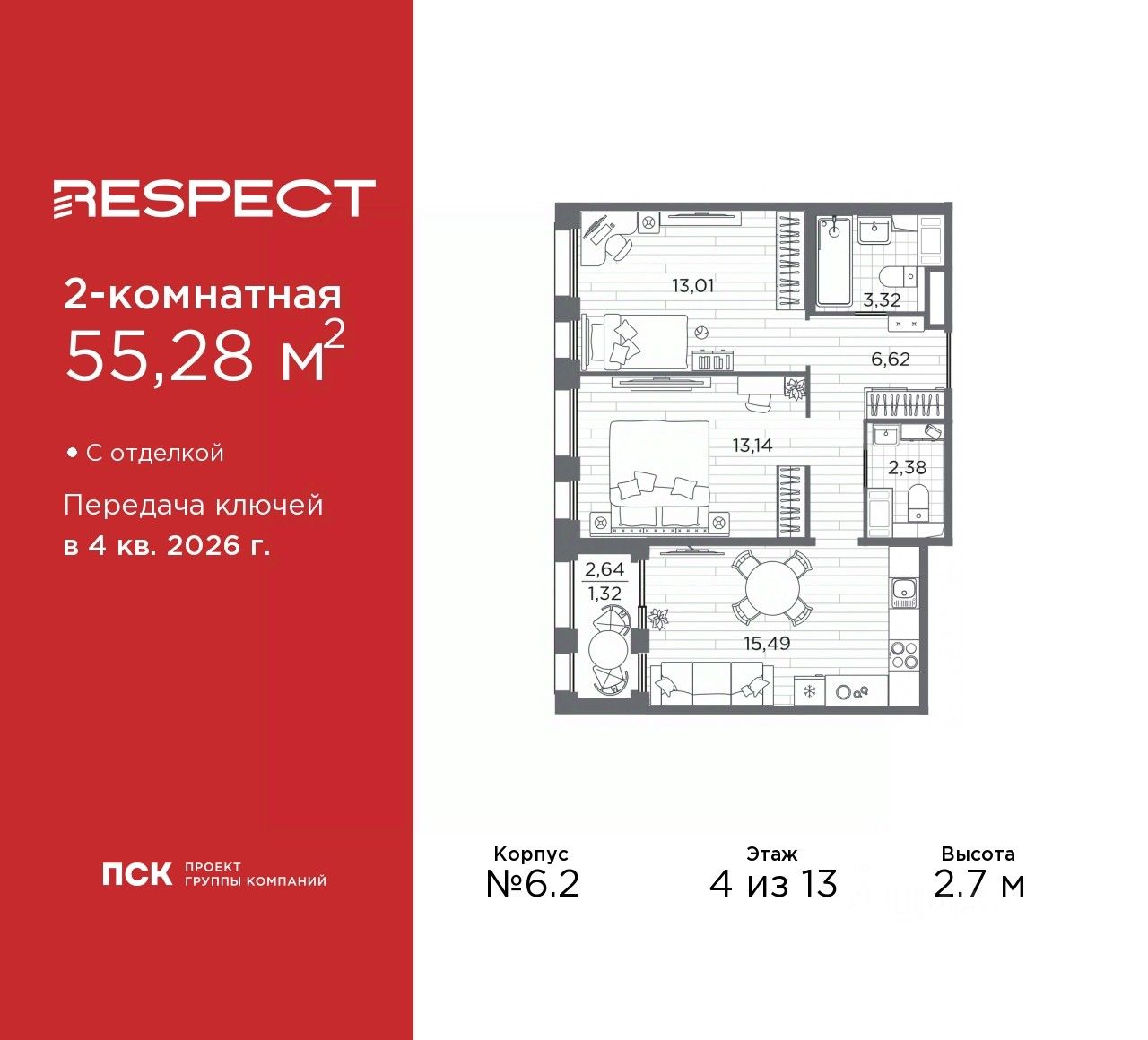 Продается двухкомнатная квартира с отделкой в ЖК "RESPECT" на 4 этаже. Общая площадь: 55.28 кв.м., жилая: 26.15 кв.м., площадь просторной кухни-столовой: 15.49 кв.м. Комнаты изолированные, все окна выходят на одну сторону. В квартире одна лоджия, один совмещенный и один раздельный санузел. Высота потолков 2.7 м.
