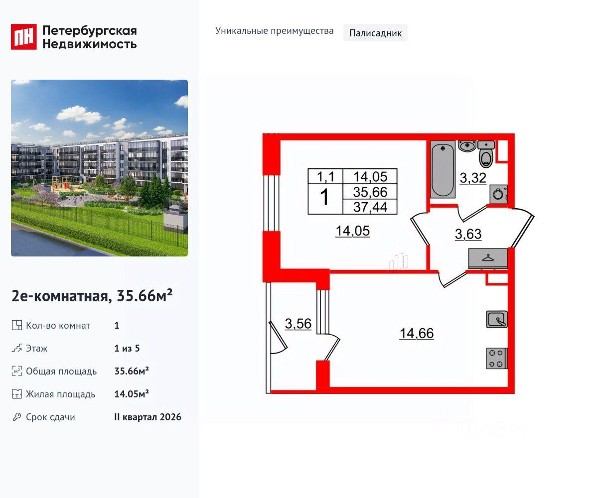 Уникальная, функциональная европланировка, большая кухня-гостиная 14.66 м², вместительная прихожая 3.63 м². Общая площадь квартиры - 35.66 м², жилая 14.05 м², высота потолка 2.77 м.