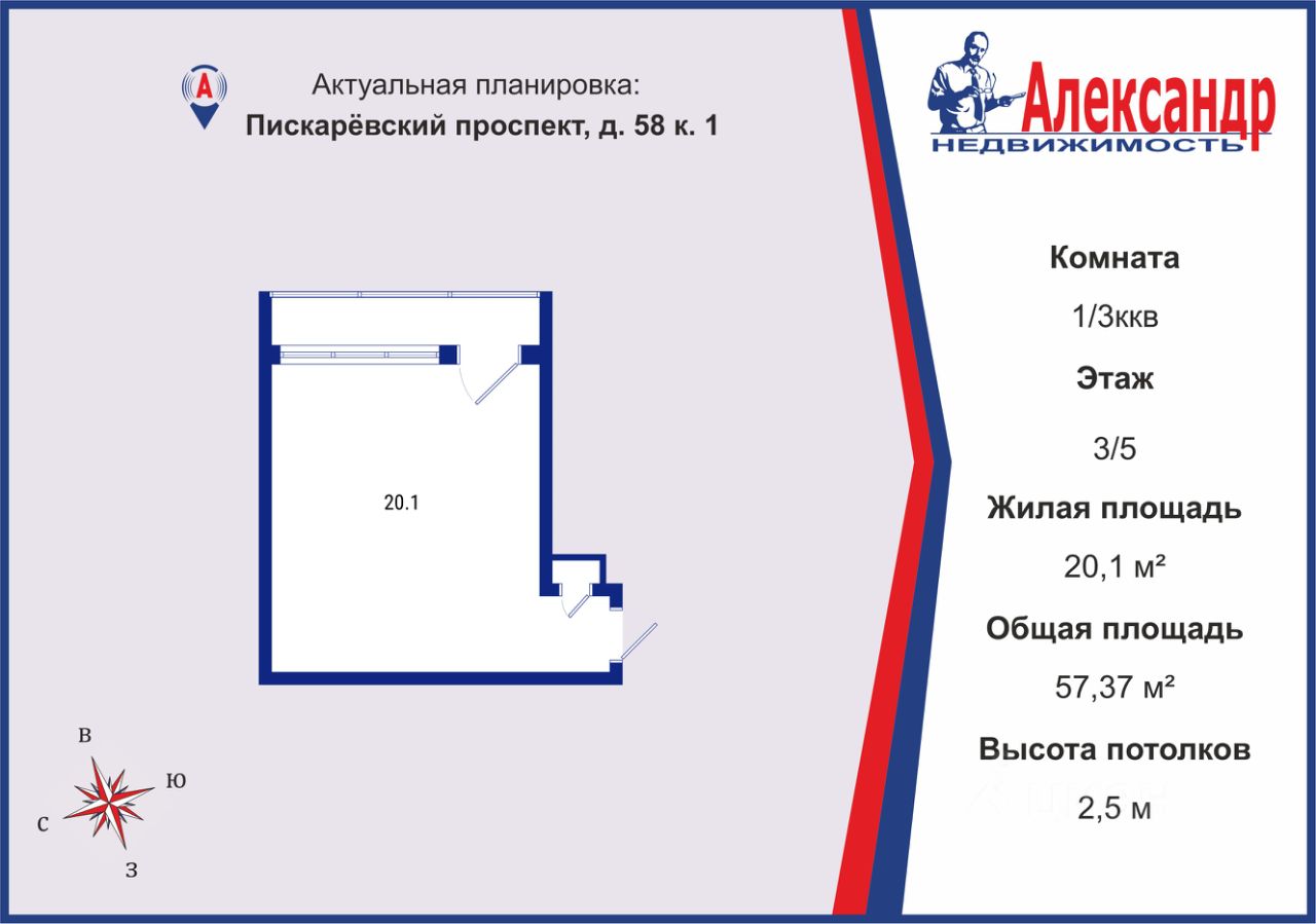 1699717   В Калининском районе г. Санкт -Петербурга продаётся просторная комната в малонаселённой трёхкомнатной квартире.