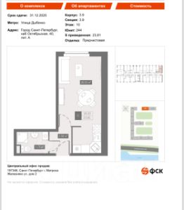 Однокомнатные апартаменты 23,81 кв.м. в ЖК "ZOOM на Неве" с отделкой!!!