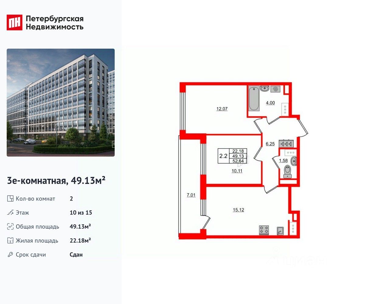 Удобная, классическая, функциональная европланировка, большая кухня-гостиная 15.12 м², вместительная прихожая 6.25 м². Общая площадь квартиры - 49.13 м², жилая 22.18 м², высота потолка 2.77 м.