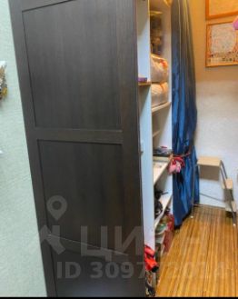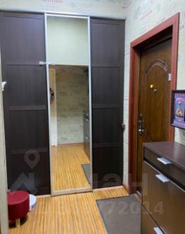 В прихожей за сдвижными дверьми с зеркалом гардеробная с организованной системой хранения:полки, стеллажи, ящики, перекладины,
