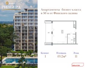 Продаются просторные апартаменты у самого берега Финского залива площадью 49,2 м2 в комплексе бизнес-класса "Морская Ривьера". Располагаются в единственном корпусе на 11 этаже из 12.