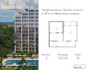 Продаются просторные 2-комнатные апартаменты у самого берега Финского залива площадью 111,7 м2 в комплексе бизнес-класса "Морская Ривьера". Располагаются в единственном корпусе на 12 этаже из 12.